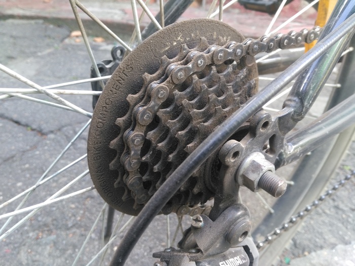 Самый страшный "пациент". Тормоза работают кое как - необходима замена тормозных колодок и последующая настройка тормозной системы; задний переключатель был деформирован после попадания в спицы и требует замены; рисунок задней покрышки направлен в противоположную сторону; растяжение цепи выходит за пределы нормы; от тормозных тросиков осталось одно название...