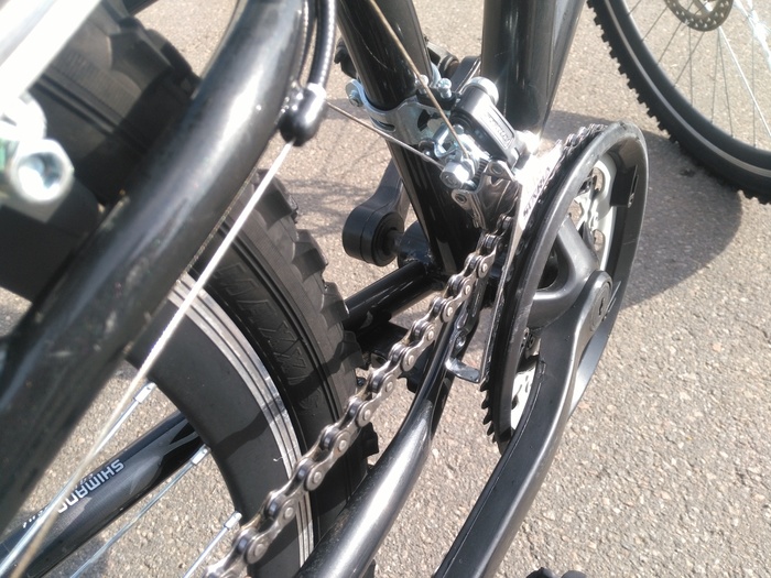 Один из моих первых коммерческих клиентов. Велосипед после "крутого" падения, в результате которого передний переключатель был деформирован и цепь застряла между ним и рамой. Малейшая деформация любого из переключателей скоростей требует его замены (ремонт хоть и возможен, но совсем не оправдан).