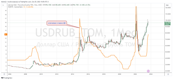 Также если вспомнить февраль 2022 года, то тогда ЦБ повышение ставки объяснял защитой рубля от дальнейшей девальвации: "повышение ключевой ставки позволит обеспечить увеличение депозитных ставок до уровней, необходимых, чтобы компенсировать возросшие девальвационные и инфляционные риски". Собственно если наложить график курса доллара на график ключевой ставки ЦБ, то сразу будет видна взаимосвязь.