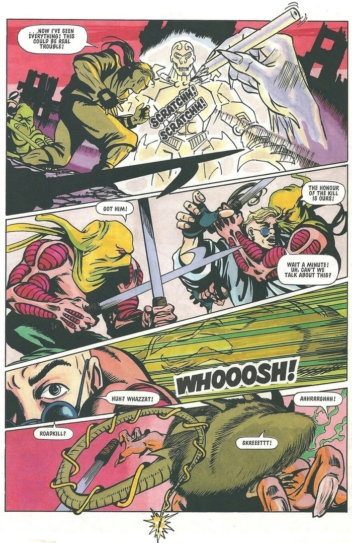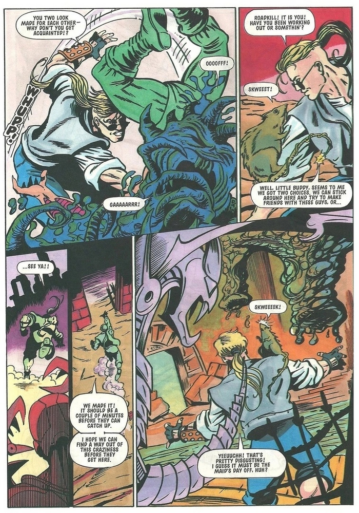 К тому же, мы, ВНЕЗАПНО, в комиксе. Могучими вертушками отправляем в полет наших противников, ломая стенки - негоже свое hp тратить, разбивая кулаки о преграды. Не забывайте прибегать к помощи Роадкилла, он чует спрятанные на страницах бонусы в виде аптечек, оружия и достаёт их, надрывая бумагу. А если чувствуете, что пришельцы одолевают числом и умением, но есть немного «лишнего» здоровья - Тернер может оторвать от комикса кусочек бумаги и запустить в них смертоносный бумажный самолётик. Или же, ненадолго перевоплотиться в супергероя и раздать всем присутствующим воспитательного тумака.