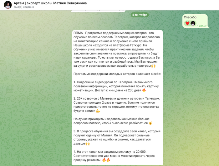 И, конечно же, в этих видео была реклама курсов, которые, как утверждал автор, обучат меня создавать телеграм-каналы и зарабатывать на них. 💰 После долгих раздумий я решился написать одному из менеджеров, которые продают эти мануалы, и узнать, как можно приобрести курс. Стоимость оказалась немаленькой – целых 80 500 рублей. Сразу отдать такую сумму было для меня слишком сложно, поэтому я решил оформить рассрочку. 💸