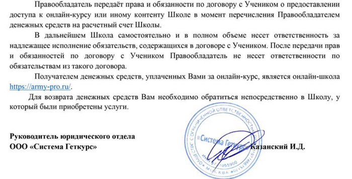 И тут, не долго раздумывая, я решил отказаться от этого курса и попросить вернуть свои деньги. Закон, вроде бы, на моей стороне. Согласно статье 782 Гражданского кодекса РФ, заказчик имеет право отказаться от исполнения договора возмездного оказания услуг, при условии оплаты фактически понесенных исполнителем расходов. Согласно условиям оферты, которая ранее находилась по адресу https://army-pro.ru/offerta (теперь сама оферта удалена), мне предоставлялась информационная услуга в форме онлайн-курсов. 📚