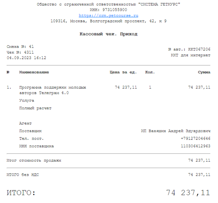 Итак, давайте продолжим наше расследование. Оказывается, ситуация гораздо сложнее, чем казалось. По логике, если Геткурс действует как агент, то Пошешулин Матвей должен быть принципалом, по крайней мере, таким образом это должно работать. Однако, здесь возникает интересный поворот. Если мы внимательно посмотрим на чек, который предоставляет Геткурс, то увидим, что поставщиком курса Матвея Северянина указан как ИП Ваняшин Андрей Эдуардович с ИНН 110306412963. 🕵️♂️