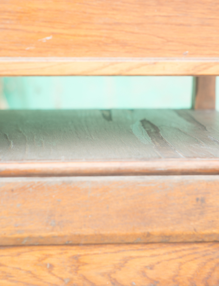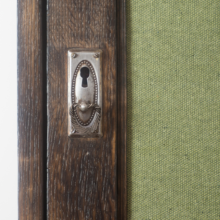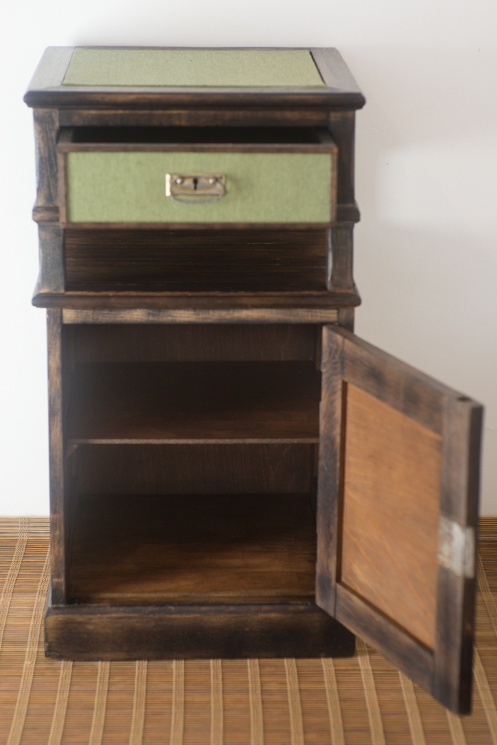 Этими же бамбуковыми палочками выложено пространство "для бумаг" между верхней и нижней частями тумбы. Раньше там был шпон, но его пришлось убирать из-за множественных сколов, вздутий и проч. дефектов. Обновление шпона рассматривалась, но крестовая форма выкройки со сложным методом приклейки делало приклеивание почти невозможным без разборки навершия. Разбирать было опасно, потому что множество элементов из которых навершие собрано, были проклеены заметно качественнее, чем был приклеен старый шпон. Сломать побоялись. Плюс цвета (даже с учетом морилок) и фактуры имеющихся у нас сортов шпона совершенно не подходили. Слишком ровный, однородный деревянный шпон не соответствовал неровной, выразительной, весьма рельефной древесине тумбы. Решили кардинально - не шпон, а ткань и бамбук.