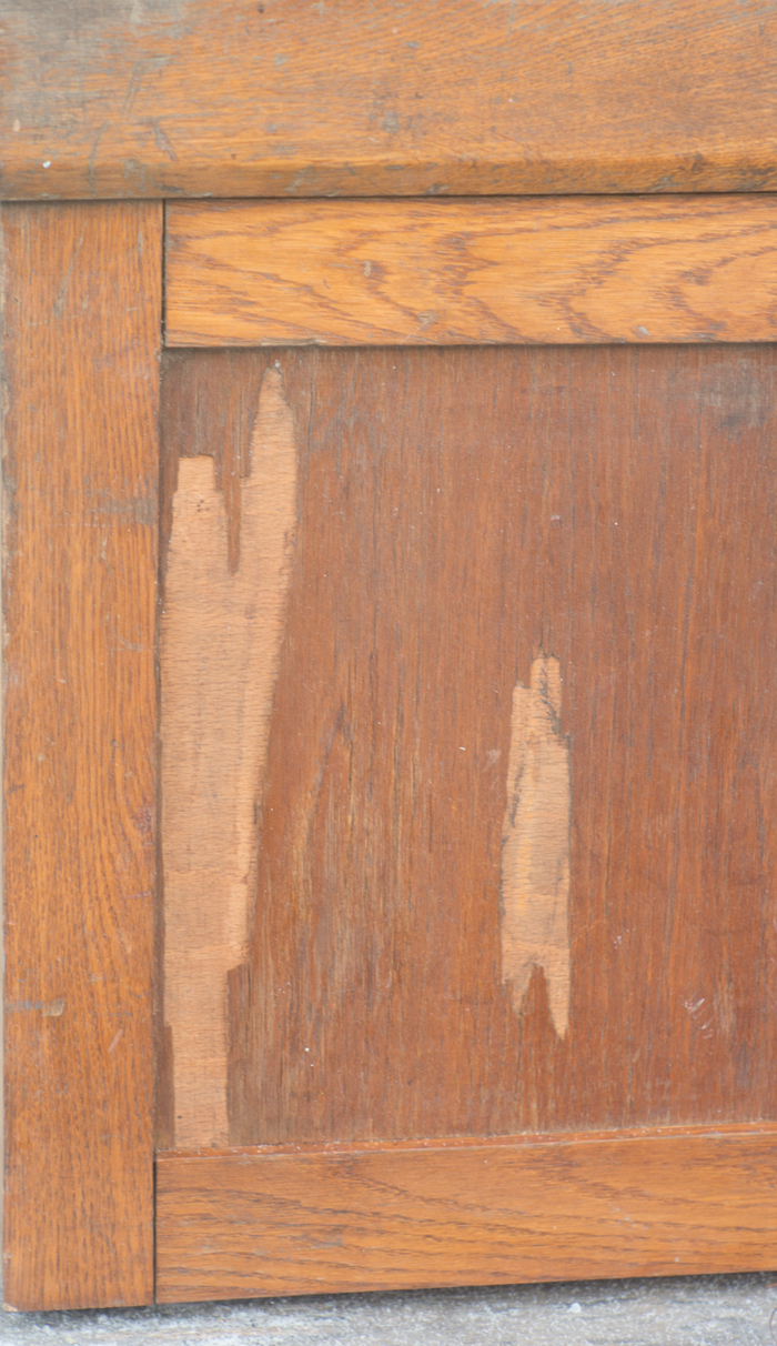 После лака, был убран старый шпон (местами ножом, стамеской, где-то пришлось взять рубанок). Шпон держался на крошащемся столярном клею. Фанеровщик клей наносил очень неравномерно: было видно где он макнул кисть в клей и где касался ею основы.