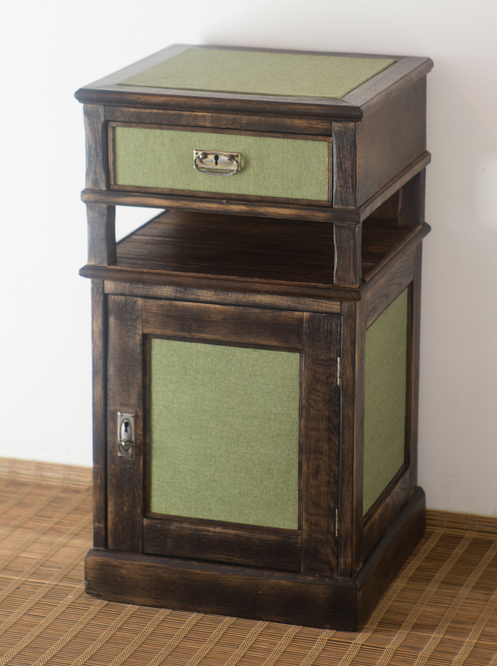 Основным цветовым акцентом стала плотная зеленая ткань (что-то типа брезента), по периметру - продольно-катаные в вальцах бамбуковые палочки из старой циновки. Палочки тоже обожжены.