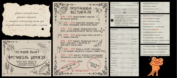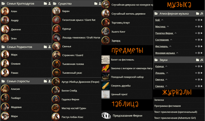 Все жители деревни, монстры и животные тоже есть. У некоторых даже придуманы способности для атак. Например хрюшка может напасть на вас своим грязным пятачком. Предметы, раздаточные материалы, музыка и даже таблица — все готово: