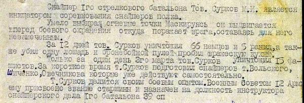 «Снайпер старшина Михаил Сурков стреляет по врагу уверенно и точно. Раненых у него не бывает - он бьёт наповал. Когда счёт убитых им фашистов перевалил за 700, на очередную "охоту" с ним отправился кинооператор. Оба залегли в кустах. Первый же показавшийся в поле их зрения гитлеровец поплатился жизнью. Это был 702-й "сурковский" меткий выстрел».