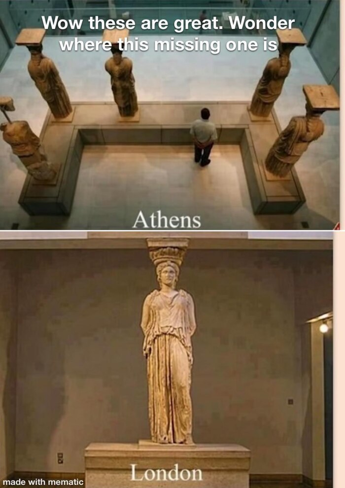 Пошалила Британия и в Греции. Шустрые ребята прихватили мраморные скульптуры Парфенона, которые называют «мраморами Элгина» в честь шотландского дворянина...который их и забрал.