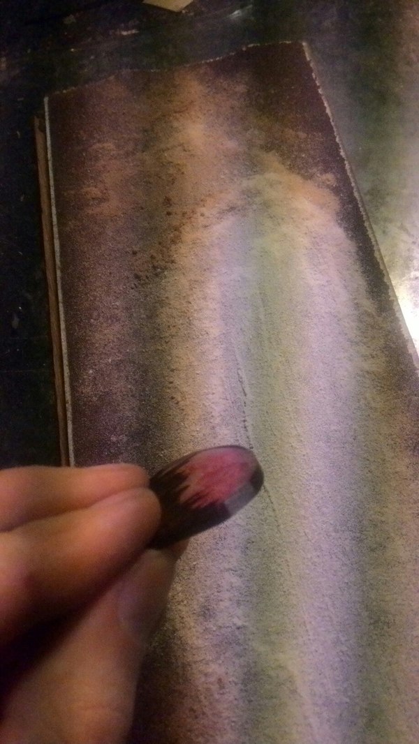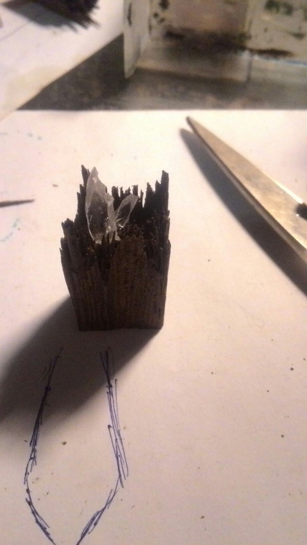 Далее, чтобы примерно представлять, где мне нужно делать всякие разводы красителем и приклеивать ледышки, чтобы это было похоже на тот кулон, я примерно рисую и вырезаю медиатор из бумаги, приклеивая его к деревяшке: