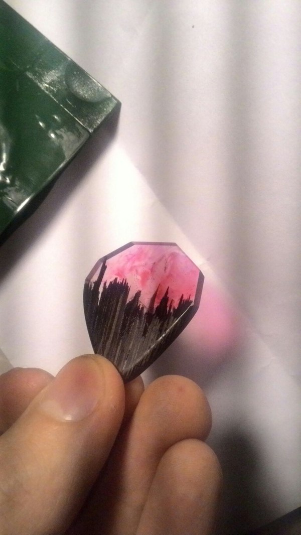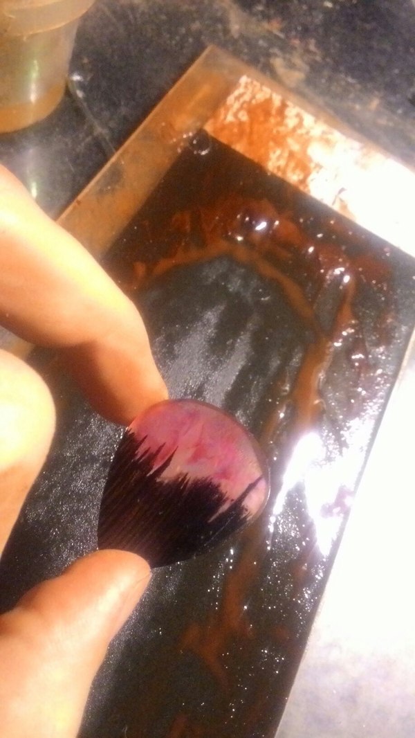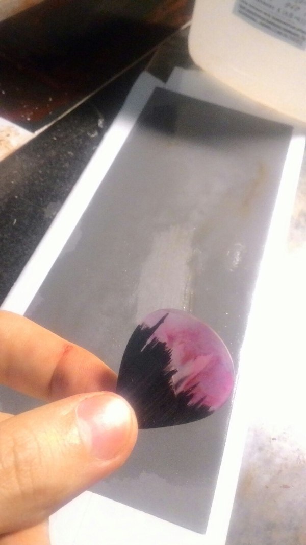 Из того же орг стекла склеиваю коробочку, промазываю стыки пластилином, чтобы смола не имела возможности сбежать из моего прекрасного медиатора. Ю шел нот паст. Клеим свою деревянно-бумажистую заготовку к днищу, чтобы она не всплывала как пельмешки. (Кстати уголок бумажки потом всплыл, почти засрав мне всю работу, но так как я оставил 2мм дополнительной толщины, я сточил ровно до этой бумажки, мне повезло)