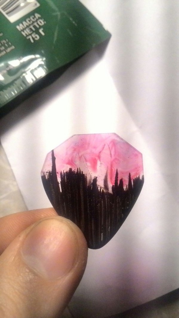 Фотографируем готовый медиатор на фоне пачки кофе (это обязательно, если делаете медиатор, всегда фотографируйте его рядом с пачкой кофе), отправляем эту фотографию клиенту, он говорит воу, вау, отправляйте его мне быстрее. Не смотря на то что фотография сделана на телефон, ночью и без должного освещения. Далее мы радуемся, что заказчику понравилось, но кофе не пьем. Кофе на ночь вредно. И вообще вредно. Чай с травками вот хорош.