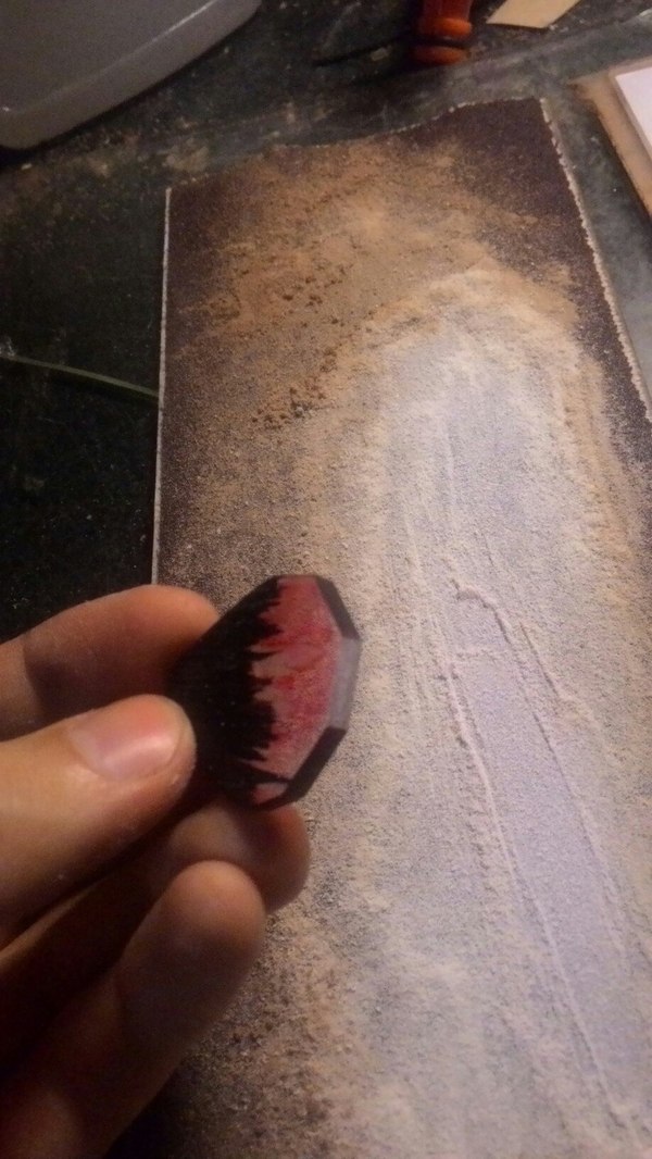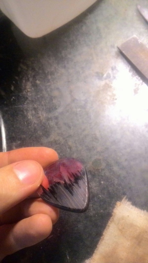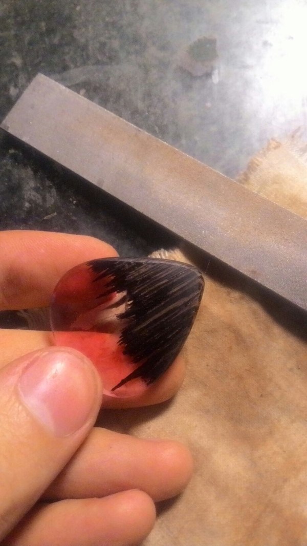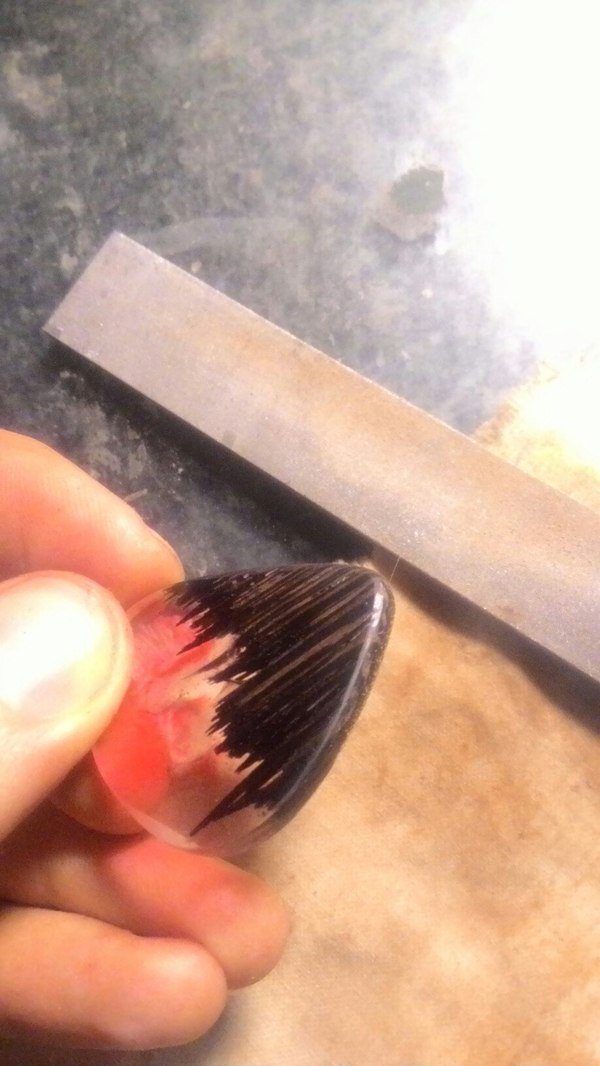 Естественно, каждую грань мы проходим так же на 5 наждачках и полируем до состояния суперпрозрачности и отсутствия даже минимальных царапин. Если вдруг рука дрогнулась и ты облажался в сторону лицевой части медиатора, то придется делать грань ниже и ниже, пока не сточишь медиатор нахрен и не начнешь делать новый. Поэтому приходится держать свои шаловливые ручки под контролем.