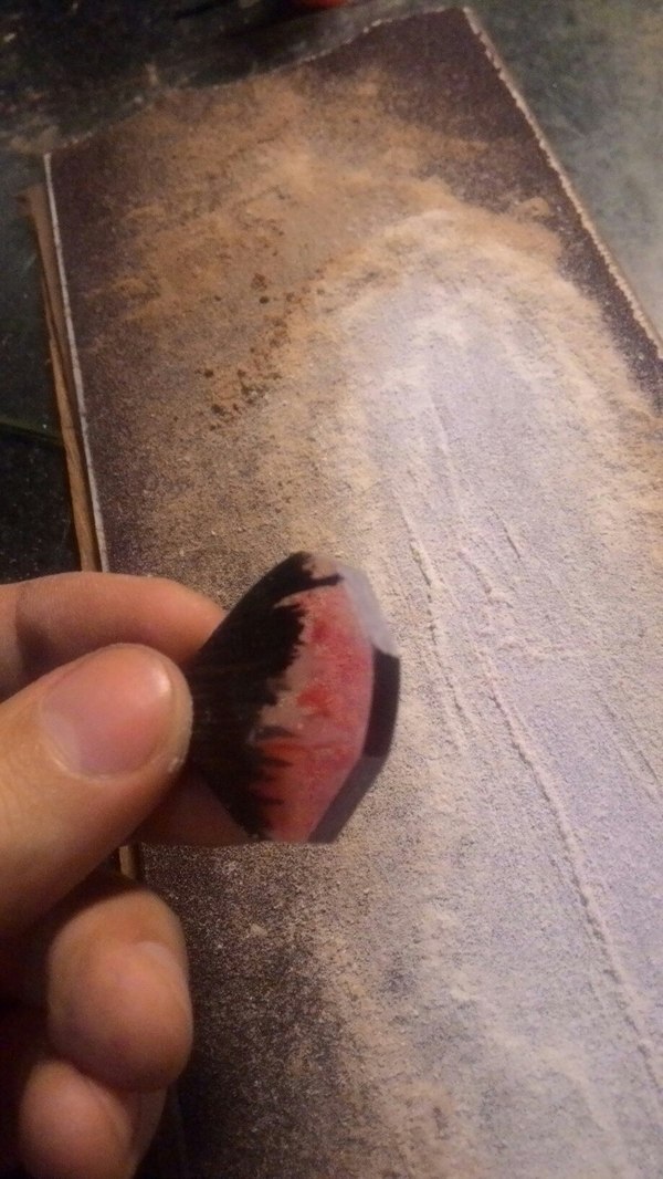 Далее шлифуем все это дело на грубой, как работники почты России наждачке, до толщины 3.5мм (Запасы, нам нужно больше запасов) и вырезаем из этого всего по контуру заранее заготовленного шаблона ( который я не сфотографировал) нечто похожее на медиатор:
