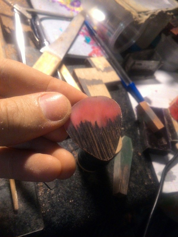 Когда все отполировано до состояния суперпрозрачности, чтобы слеза младенца по сравнению с ним казалась просто грязной каплей, мы начинаем закруглять деревянную часть, чтобы это было похоже на медиатор, а не на угловатый кусок.... угловатый кусок. Я делаю это ювелирным напильником, чтобы не облажаться и не снять случайно сразу пол изделия одним движением.