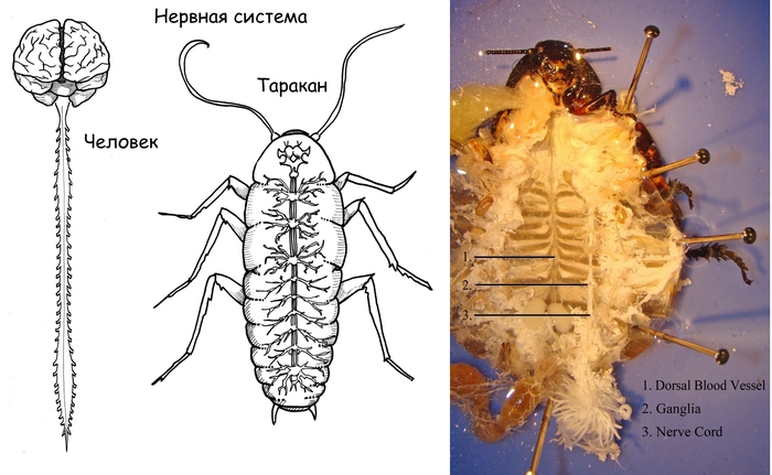 Нервную систему тараканов в прогрессивных Европе и США вообще изучают отдельно, даже в рамках школы, из-за особенностей строения и доступности для наглядного препарирования. Тараканьи мозги состоят из 11 узлов, из которых только 2 в голове, 3 в груди и 6 в брюшке. Самый крупный, конечно, в голове, но это вызвано тем, что там расположено больше всего функций: органы зрения, усики, органы обоняния, обаяния и осязания. Грудные узлы отвечают за часть рта, ноги, крылья, мышцы головы и груди. Особенности раздельного обслуживания частей тела привели к тому, что, если отхлопнуть бедолаге голову, в глобальном смысле с ним ничего не произойдёт. Он просто потеряет конечность, на которой расположены глаза, усы и рот. Ранение не смертельное, но без рта таракан умрёт от жажды за неделю. Аналогично и с другими частями - если не затронуты жизненно важные органы, то потеря жопы, например, грозит только проблемами с размножением и пищеварением.