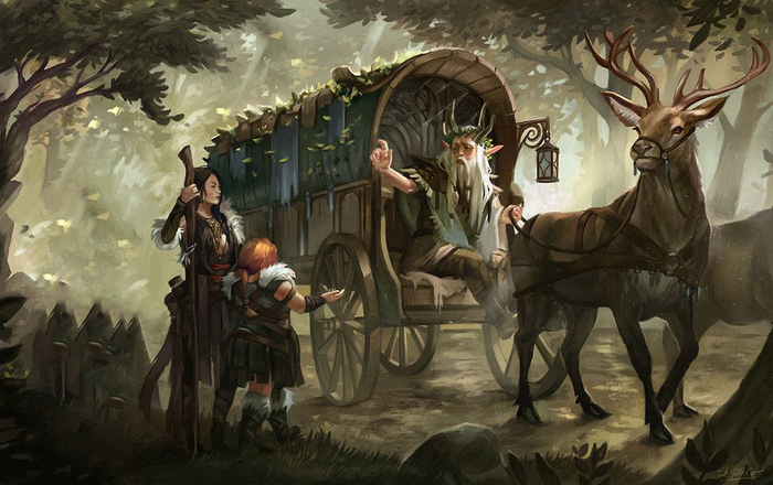 На одной из развилок мы повстречали старичка эльфа на повозке, от которого в сторону степей направились две женщины (одна из которых была дворфийка, но Тамас ее не заметил). Я спешился с повозки и отошёл от каравана в сторону старичка.