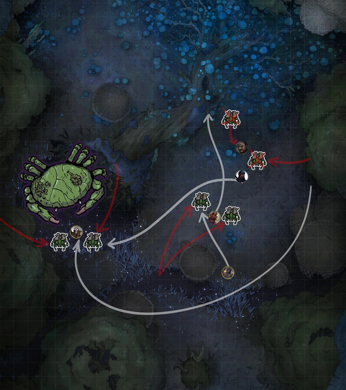 Когда я пришел в себя передо мной было два сорняка, с которыми сражался Фьюз, а возле Орума из болота вылез здоровенный краб, покрытый травой, илом и грязью. Размером он был чуть выше пояса обычного человека, а его острые клешни делали его еще смертоноснее.