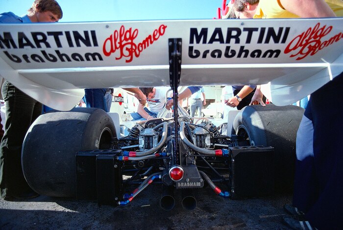 Первые тесты Brabham с двигателем Alfa Romeo 115-12 3.0 V12 в Поль Рикаре 1975г. Двигатель оказался ненадежным и прожорливым, за 4 сезона всего две победы и три поула