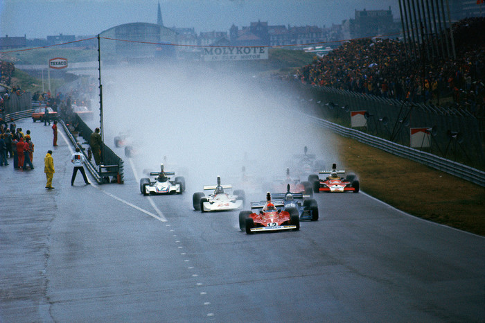 Впереди Ники Лауда (Ferrari 312T), Джоди Шектер (Tyrrell 006), Джеймс Хант (Hesketh 308В).