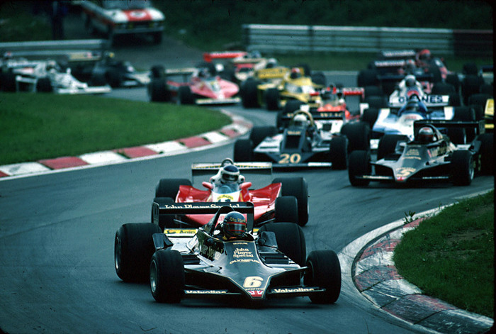 Впереди Ронни Петерсон (Lotus 79), Карлос Рейтеманн (Ferarri 312T3), Марио Андретти (Lotus 79), Джоди Шектер (Wolf WR5)