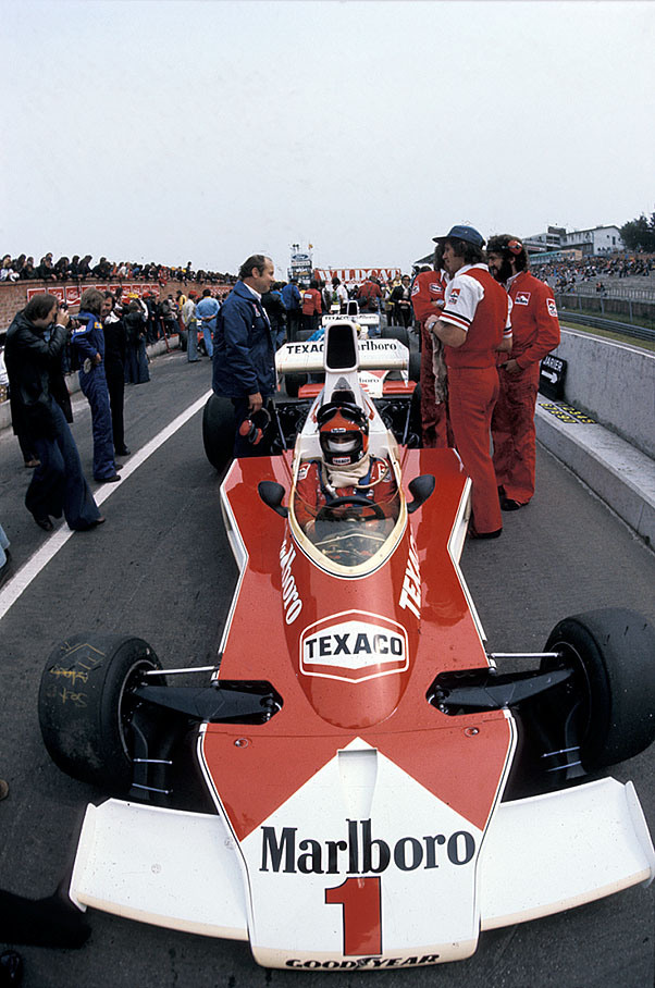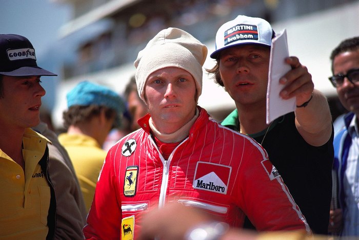 Ники Лауда на ГП Франции 75 - поул и победа, слева от него «австрийский голос формулы-1» Хайнц Прюллер