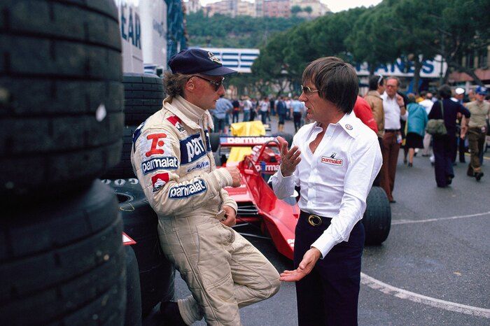 Ники Лауда и Берни Экклстоун на ГП Монако 79. На заднем плане Brabham BT48. Устав от ненадёжности моторов Альфа-Ромео Ники в конце сезона заявил о завершении карьеры в Ф-1.