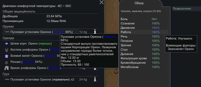 Напали 5 бомжей. Похоже, те, что выронили крутой топор и мега-шлем были из той же фракции, судя по их тактике и снаряжению. Пленников у меня навалом, поэтому просто оставил этих умирать. Пострадал только Старри от дружественного огня – пока он своим топором пытался дотянуться до врагов, получил пуль от напарников. Отправил Бумер к союзникам, установил полученный генератор – он переносной, занимает 1 клетку и создает 450Вт из ничего, весит 8кг – его можно брать в походы с парочкой турелей. Слухи, о том, что можно вырезать у пленника экзоскелет, подтверждены. Он занимает слот позвоночника, поэтому без него пленник теперь больше не будет пытаться сбежать, удобно.