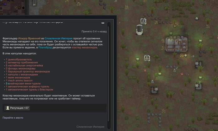 Второе задание тоже дарует мне репутацию или милость короны. Последнее мне некуда девать, без этого не могу отстроить тронный зал достаточно красивый, выбираю репутацию. Само задание вынуждает меня стать приманкой для кластера с механоидами. Тут много незнакомых и страшных слов, но мы же не боимся трудностей, верно?