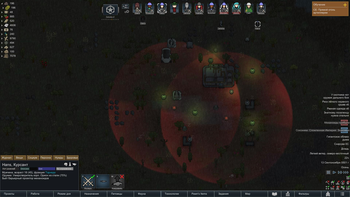 Пленника без позвоночника выгнать нельзя, эвтаназия – наш путь. Некоторые из них передрались, поселенцы тоже не скучают – кто-то опять откопал труп Унай, кто-то матерится, кто-то обжирается. Матерщинника я вырубил, чтобы не портил настроение другим. Наблюдение – скилл медицины прокачивается с огромной скоростью, если лечить раненых этим ножом – ранений много, за каждый ушиб навык поднимается на 200-400 единиц. Наблюдение 2 – приключенец с ножом прокачивает скилл ближнего боя на манекене на 30000 ед за пару игровых часов. Наблюдение 3 – нож в охоте очень эффективен, но пешки не хотят охотится без автомата, приходится делать ручной контроль. Имба!