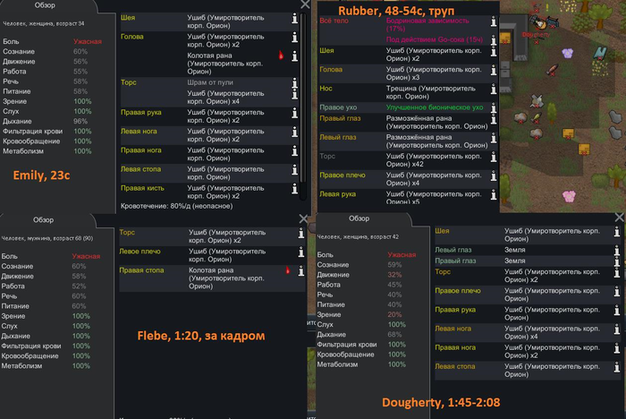 Я переиграл еще несколько раз, чтобы записать видосик через Camtasia. К сожалению, начало записи все равно протерялось и прямо первая секунда начинается с крови, мяса и кишок. В начале добавил аннотацию, чтобы было понятно, где кто из моих стоит. Удачная получилась заварушка – враги заагрили на себя шальной пулей бродячего ленивца, и он одному бандиту успел отломать ногу. Хорошо видно, как на 48-54 секундах Старри делает десятки тычков ножиком во врага. Вражина была крепкая (Живучесть) и под го-соком, поэтому упала не от боли, а от того, что немного померла – "прочность" торса упала в 0. Специально подсчитал – 91 ушиб ножом в разные части тела + досталось еще в нос и по моргалам.