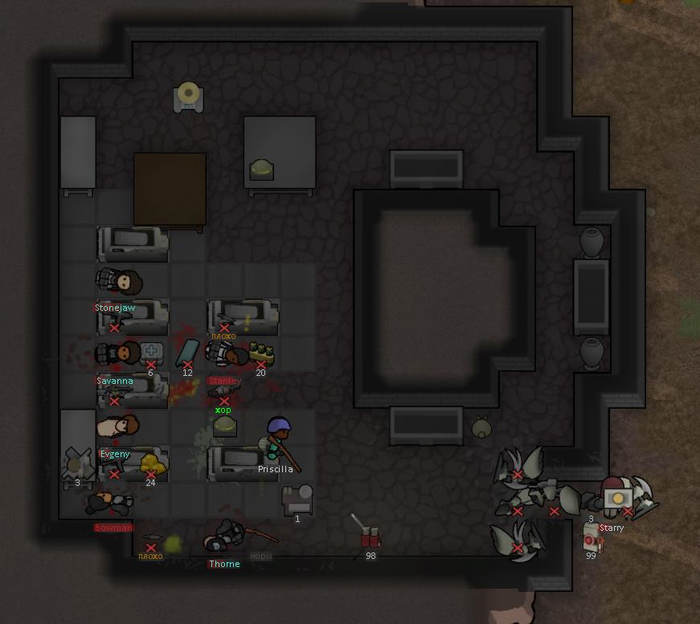 Захватил всех, чтобы раздеть, а потом выпущу на волю. Репутацию не получу, но хоть будет небольшой бафф к настроению для поселенцев. Комната для пленников 6х6 забита под завязку – в ней 10 человек. Ой, чувствую передерутся и попробуют сбежать. Бедный Старри, получил не только по зубам, но и по ногам и позвоночнику и целых 6 игровых часов шёл через всю карту, чтобы упасть в кровать.