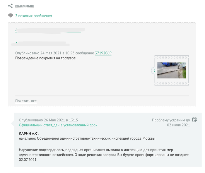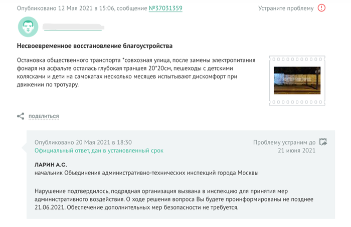 Но оказалось, что до меня люди уже обращались с этой же проблемой. Самая ранняя дата обращения 12 мая. И человек пишет, что яме уже несколько месяцев )) Потрясающая оперативность. Видимо спальные районы не в приоритете.