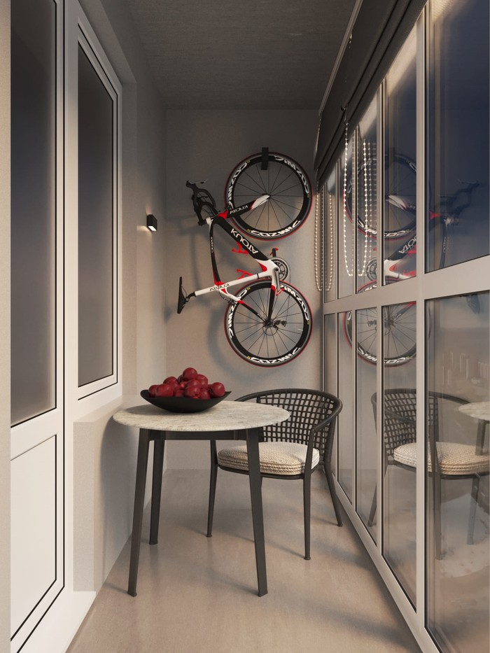 Балкон стандартной вытянутой прямоугольной формы. Разместить велосипед на таком балконе задача не из легких. Дизайнер предложил разместить его вертикально на стене. Таким образом, выступающие части велосипеда не будут мешать. Велосипед располагается позади столика и стула. Такое расположение очень удобно именно в зимний период. Поскольку, чтобы убрать велосипед, вам потребуется отодвигать стол и стул только два раза в год. В остальное время велосипед будет служить вам как арт-объект.