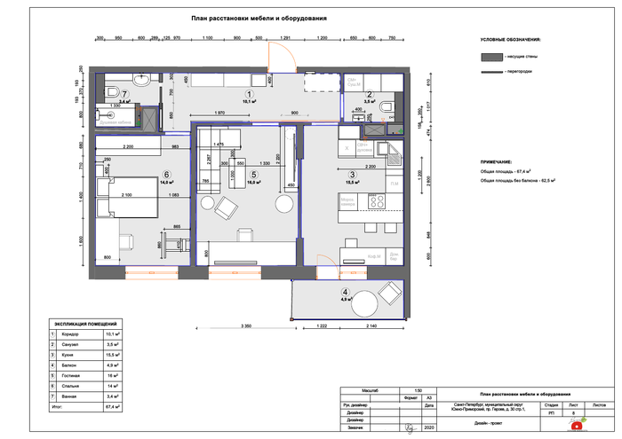 Итак, имеем квартиру, общей площадью 67,4 м2.