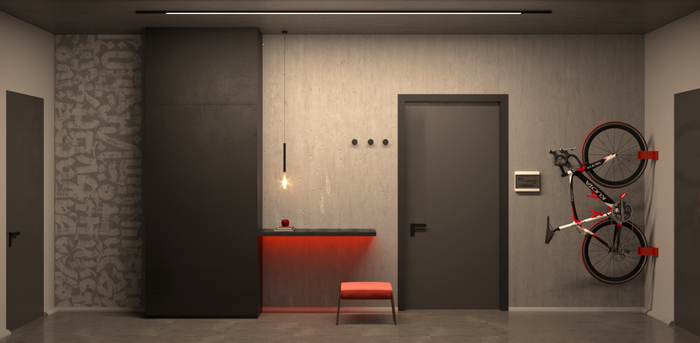 Как видите, дизайнеру удалось предусмотреть в квартире целых два эргономичных места для хранения велосипеда. Велосипед стал акцентным центром двух помещений. И его не пришлось прятать в специальных нишах и чехлах.