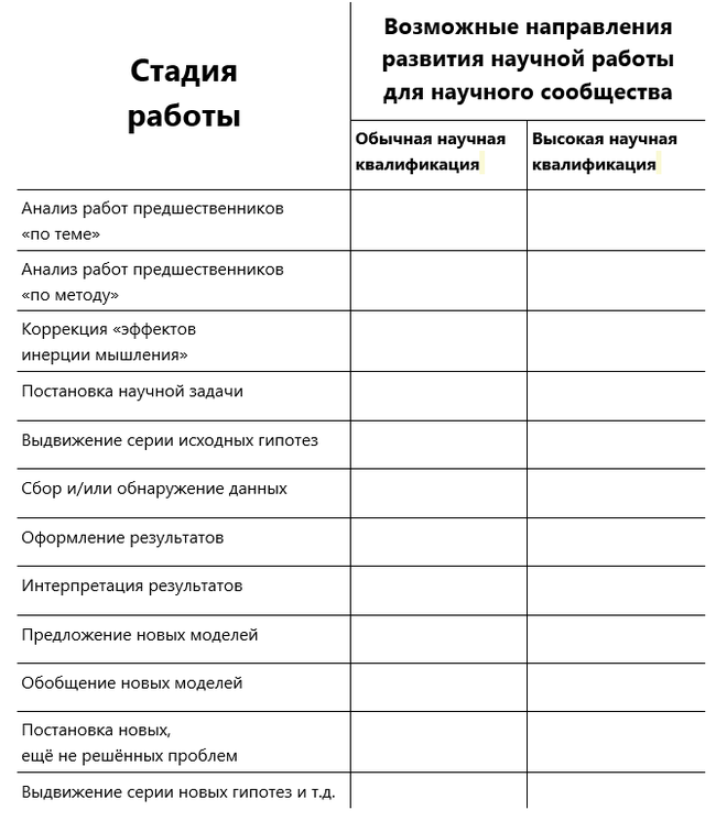 Ответ: для развития научной работы следует обсуждать её стадии (и не смешивать их, ибо на разных стадиях – свои критерии оценки – см. Таблицу №2), а не себя-любимого и свои нерешённые (!) проблемы.