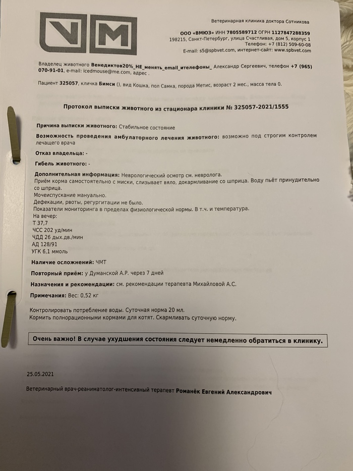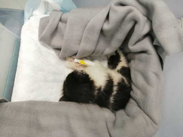 Ближе к вечеру врачи сказали, что все показатели стабильные, но кроха очень-очень слабенькая. Еле-еле держит сама температуру по нижней границе нормы, честно говоря и на лапах то она сама почти не держаться.. всё время спит.
