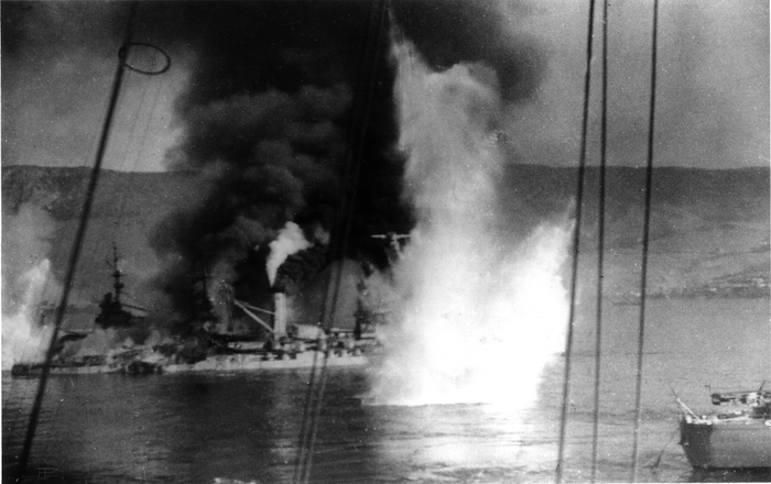 Линкор Bretagne под обстрелом британских кораблей, за несколько минут до гибели