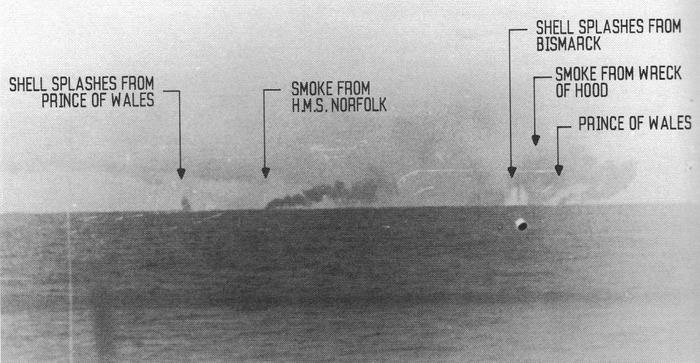 Фото, сделанное с крейсера Prinz Eugen. Справа отмечен столб дыма от разорванного линейного крейсера HMS Hood