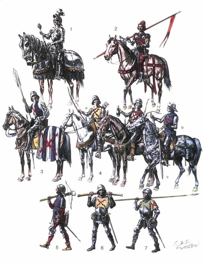 На 10 пикинеров приходилось 5 арбалетчиков и 3 кулевренера (аркебузира). В полевом сражении пикинеры развертывались в густую линию, опускались на колено и выставляли в сторону неприятеля свои пики, стрелки же должны были вести огонь поверх их голов. В первом приближении это чуть ли не испанская терция. Ну ладно, нет конечно. Но основные тенденции армий нового образца на месте – вспомогательная роль копейщиков, половина пехоты вообще стрелки. Конечно, кулеврины пока несовершенны, но тяжелые арбалеты некоторым образом нивелируют отсутствие мушкетов. То же самое с уставом – единообразие в обмундировании, единые цвета, организация рыцарей в эскадроны.