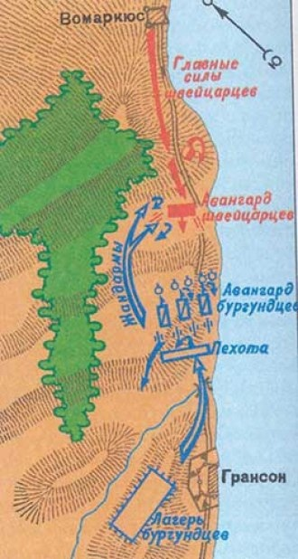 Дорога, по которой наступали швейцарцы, представляла собой не непосредственный переход из лесистых гор в долину, а отлогий спуск по усаженным виноградом холмам. В такой местности Карл почти совсем не мог пустить в ход ни одного из тех двух родов войск, на которые он по преимуществу возлагал надежды, – рыцарство и артиллерию. Поэтому Карл принял решение – развернуть свое войско в долине и там встретить атаку швейцарцев.