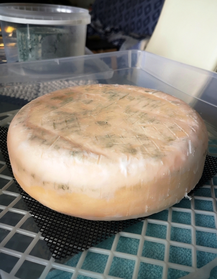 - будьте готовы, что на протяжении процесса аффинажа взойдут «плесневые цветы» на поверхности смальца. Это нормально и даже хорошо. Но я взял этот процесс под контроль. Совпало, что в это момент у меня зрели сыры с разными видами плесени. Я немного пересадил плесень на поверхность защитного слоя нашей головки сыра.