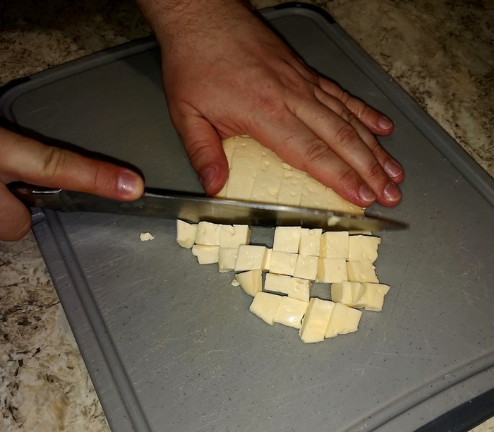 - Извлекаем пласты и нарезаем сыр кубикам со стороной ~1 см.
