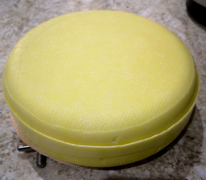 7. Наносим смалец на поверхность сырной головки (не стесняемся.... сначала на одно донышко и по бокам. Дал застыть, аналогично с другой стороны).