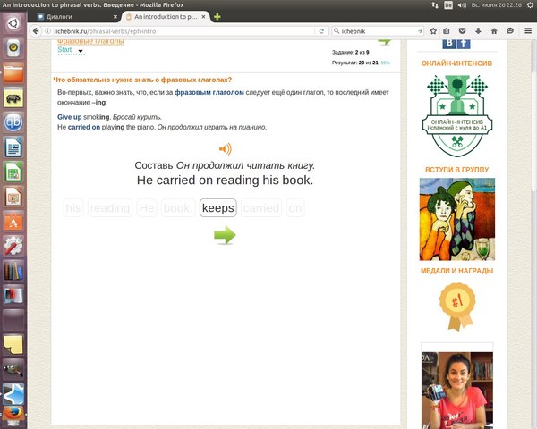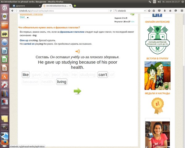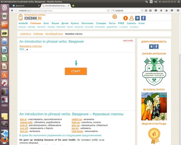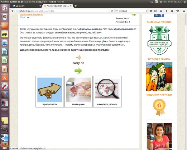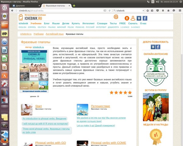 Довольно-таки приятный интерфейс, стандартный языковой набор, я решила выбрать английский, фразовые глаголы.