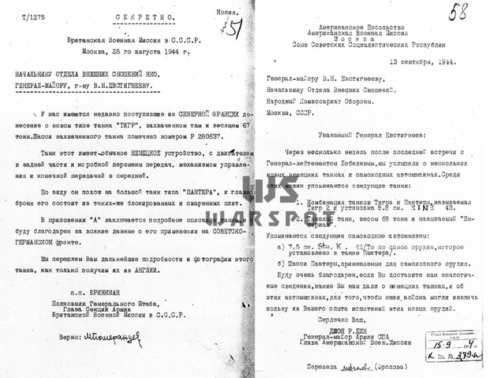 Письма из британской и американской военных миссий в СССР, посвящённые немецкой новинке. Английская сторона как воевавшая с «Королевскими Тиграми» была о них неплохо осведомлена.