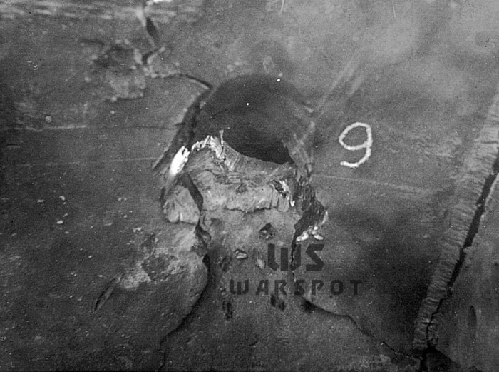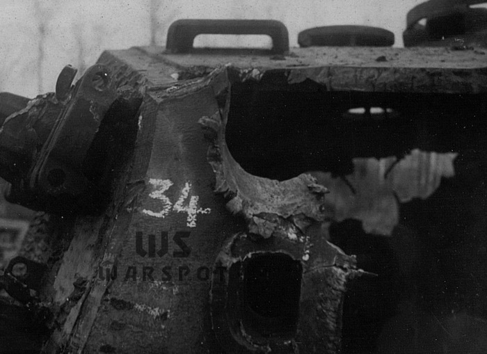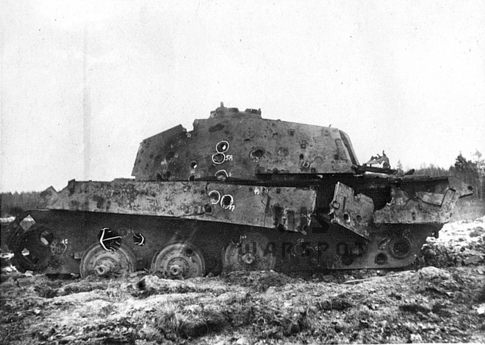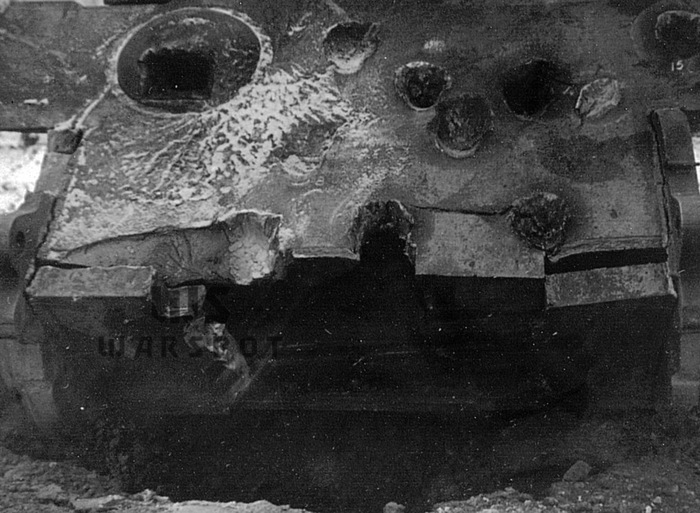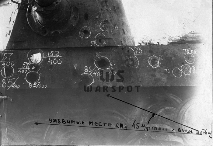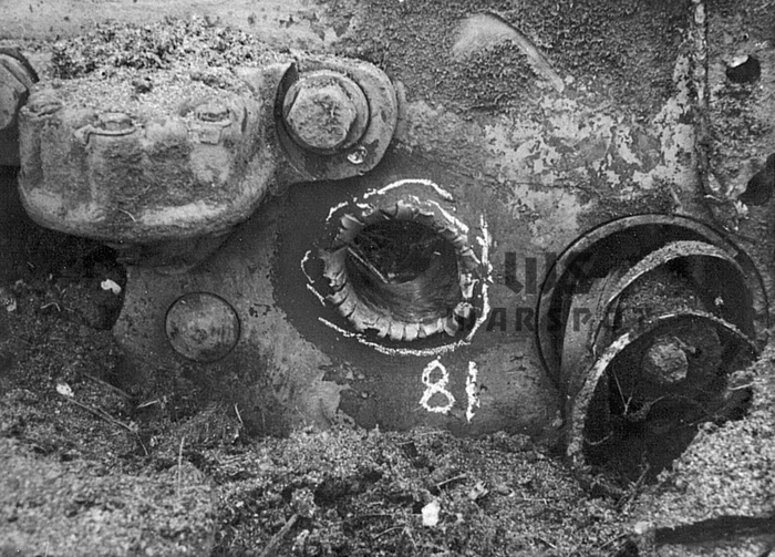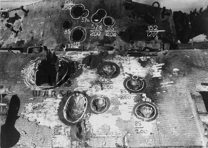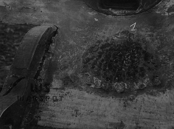 Пробитие 152-мм бронебойным снарядом в нижний лобовой лист. Более эффективным оказался огонь осколочно-фугасными снарядами, которые разрушали сварные швы и вызывали трещины в броне, а также отколы с внутренней стороны.