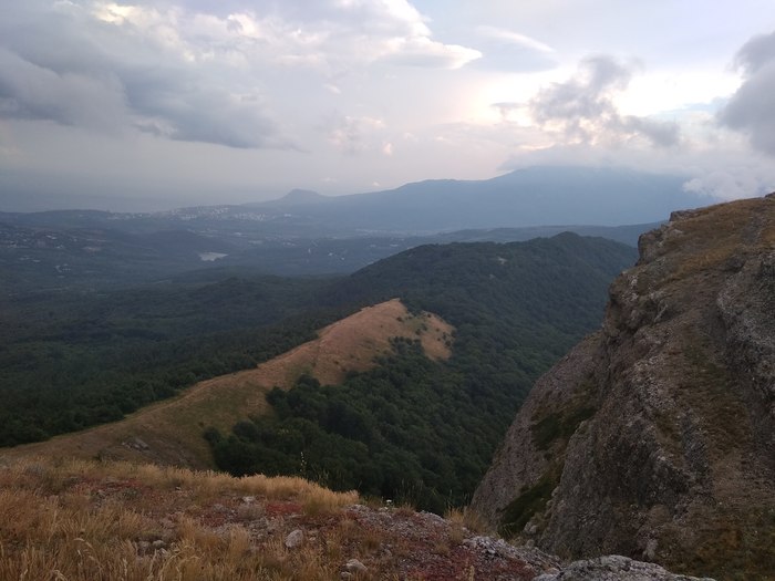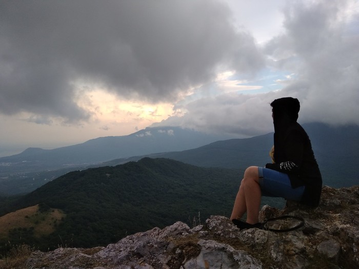 Решили начать с гор. Вариантов множество. Лично мне приглянулся вариант встречи заката на горе. Не знаю зачем, но на многих точках говорится подъем на Демерджи, хотя сама Демерджи сейчас закрыта для посещения экскурсионными группами. Экологи постарались и правильно сделали. На самом деле нас отвезли на гору Пахкал-Кая (лысый Иван). Стоимость этого удовольствия 1300 на человека. По времени это займет 4 часа плюс минус. Нам повезло с сопровождающим по имени Стас. Не успев выехать из Алушты он начал рассказывать обо всем что нас окружает, травил местные и не очень байки. Вешал лапшу на уши, но хорошо что вверх машины был открыт и она на ушах не задерживалась. Короче было весело. И с погодой повезло. В Алуште светило солнце, а над горами сгущались тучи. Я люблю такие моменты когда все идет не плану. И погода с проглядывающим солнцем в разрывах туч, с срывающимся дождем и ветром для меня стала подарком на этом развлечении. Думаю столько эмоций я бы не получила, будь погода простой и солнечной. Везли нас по стандартному маршруту. Долина привидений, симпатичное место, но лучше туда отдельно и полазить, а не вот так наскоком тут фильм снимали, тут дерево, тут камушек, а вон там фигурка. Потом крепость Фуна, где можно выпить неплохого горного чая и пострелять из спортивного лука, чем я и занялась отказавшись от разглядывания самой Фуны. Потом была остановка с лавандовыми кустиками вдоль дороги, Это не сами поля, но наши спутники с удовольствием набрали себе по пучку и запах лаванды нас сопровождал в оставшееся время. Я же проигноривовав лаванду, своей на даче неплохой урожай вырастила занималась осмотром окрестностей. А виды красивые, есть на что посмотреть. Дальнейшее описывать смысла нет. Горы прекрасны!!! Единственное нам сказали маршрут легкий, но язык в итоге на подъеме был на плече.