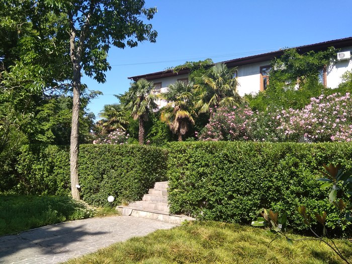 Вот от этой точки надо спускаясь вниз направо пройти км полтора до самого сада. Наслаждаясь видами на местный то ли дачный то ли обычный поселок и вот он. Такой знаменитый и любимый многими сад. Вход 300 р. Отринув предложение за отдельную плату сопровождения мы решили изучить его самостоятельно. Он не сильно большой. карты и точки где ты находишься в данный момент есть на территории сада на каждом шагу. Покушать там можно, столовая и точки общепита есть. Но цены уже значительны.